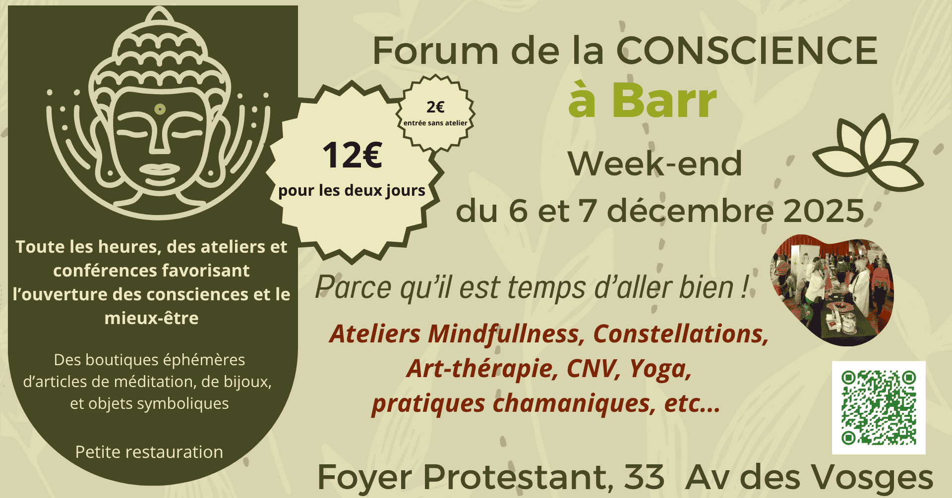 Parce qu'il est temps d'aller bien, ce forum est destiné à l'ouverture des consciences, au développement de Soi, à la santé mentale et aux pratiques du mieux-être ! Sur 3 niveaux, vous participerez à des ateliers ( Mindfullness, constellations, art-thérapie, sophrologie, yoga, etc...), tout au long des journées vous participerez à des ateliers et assisterez à des conférences pour une vie plus consciente et épanouie Un week-end à s'offrir pour mettre du soleil dans sa vie Inscription : https://www.billetweb.fr/forum-de-la-conscience