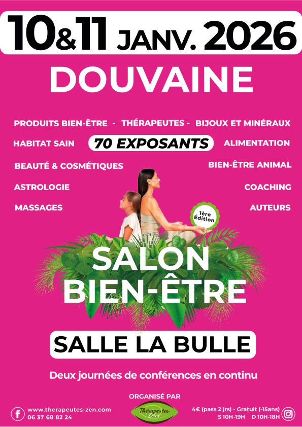 Le SALON BIEN-ÊTRE à DOUVAINE (74) 10 & 11 JANVIER 2026 - 1ère édition débutera le 10 janvier 2026 10:00 et se terminera le 11 janvier 2026 18:00 le tarif d'entrée est de 4 €.