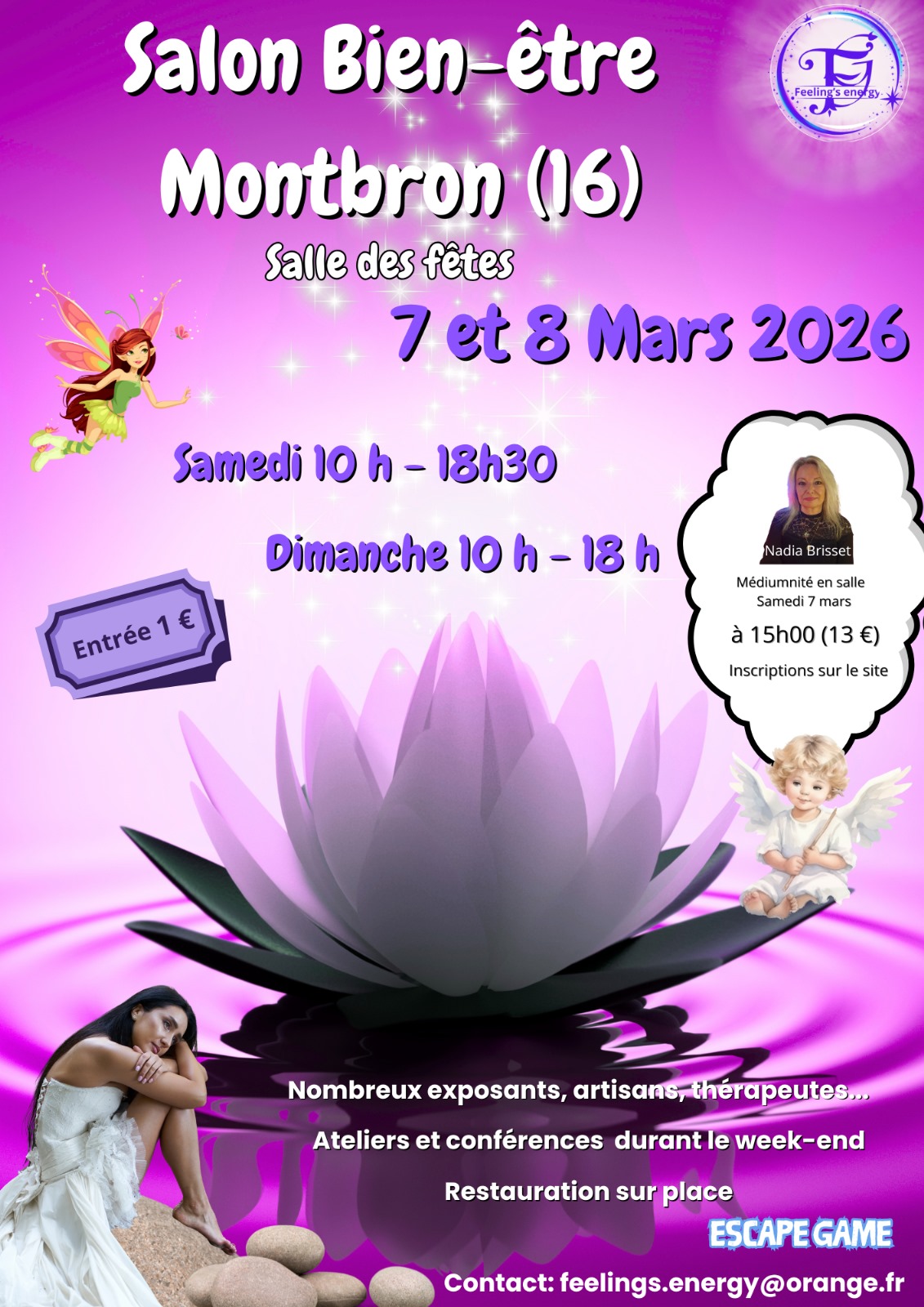 Le Salon bien-être à Montbron (7 et 8 mars 2026) débutera le 7 mars 2026 10:00 et se terminera le 8 mars 2026 18:00 le tarif d'entrée est de 1 €.