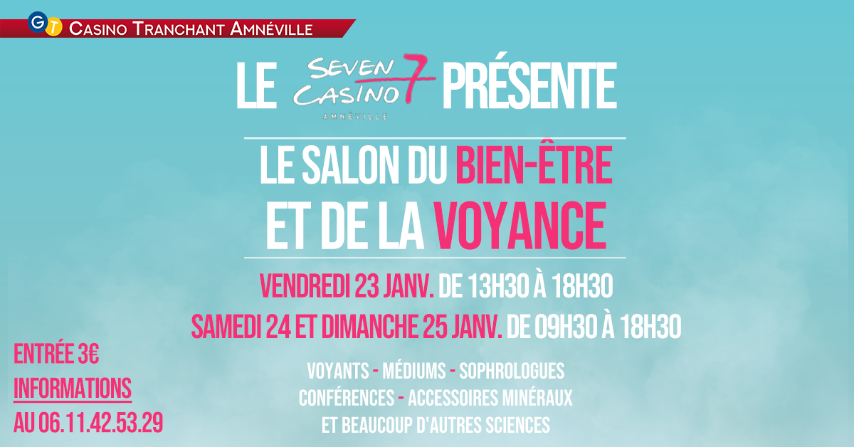 Salon des nouvelles thérapies et de la voyance au Casino d Amnéville dans la salle de spectacle vendredi 23 janvier de 13h30 à 18 heures30 samedi 24 janvier de 9h30 à 18 h 30 dimanche 25 janvier de 9h30 à 18 h30 entrée 3 € 40 exposants nombreuses conférences renseignements 06 11 42 53 29