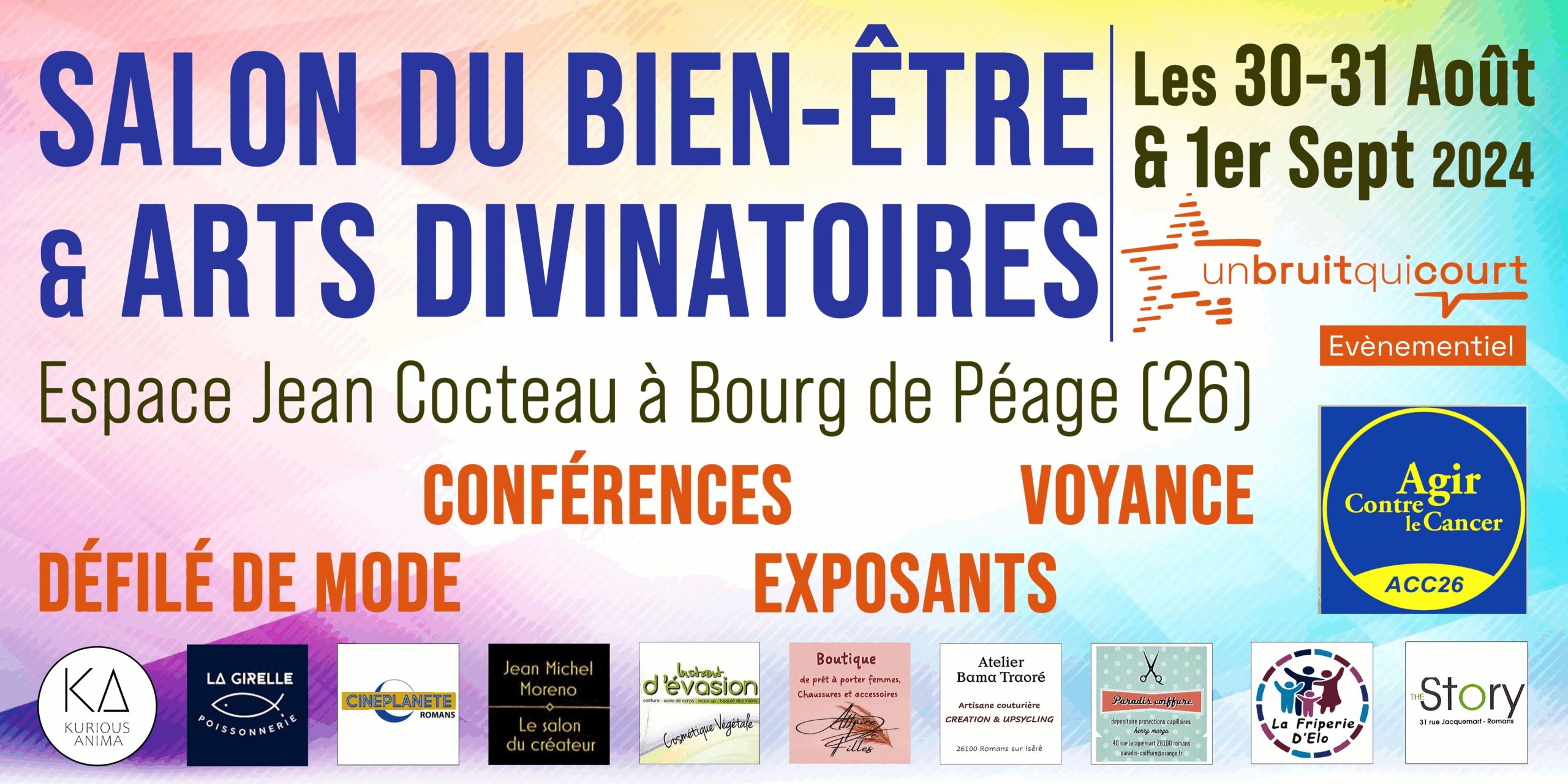 5e Salon du Bien Etre et des arts divinatoires : Conférences, Ateliers, Initiations, vente de produits, séances découvertes, consultations, expositions, vêtements, et arts créatifs... Vous pourrez bénéficier par la chaine Youtub Kurious Anima (présente sur le salon) des diffusions de vos interviews en direct et différé (60 000 vues) Vendredi 13 février 18h30, inauguration du salon avec un défilé de mode de personnes différentes e/ ou qui ont été malades. Nous insistons sur l’importance du défilé de mode consacré aux personnes malades , différentes, et âgées avec une chanteuse en live (elle même en guérison et, elle a pu supporter les traitements médicaux grâce aux soins parallèles) Par expérience , nous avons avec mos équipes de soignants (et l’autorisation du bénéficiaire et ou des familles) ; eu recours à des thérapies et ou soins énergétiques pour apaiser nos malades. Les résultats ont été bénéfiques voir surprenant. C’est dans ce sens que nous voulons véhiculer vos techniques et compétences, à des fins de Bien Etre. Dans le cadre du salon, des « personnalités / tête d’affiche » ont été sollicitées. Boissons et Restaurations rapide+ dimanche soupe de poisson maison avec rouille et crouton Don au profit de l'association locale fondation Parkinson comité drome Bien Cdt et aux plaisirs de vous rencontrer